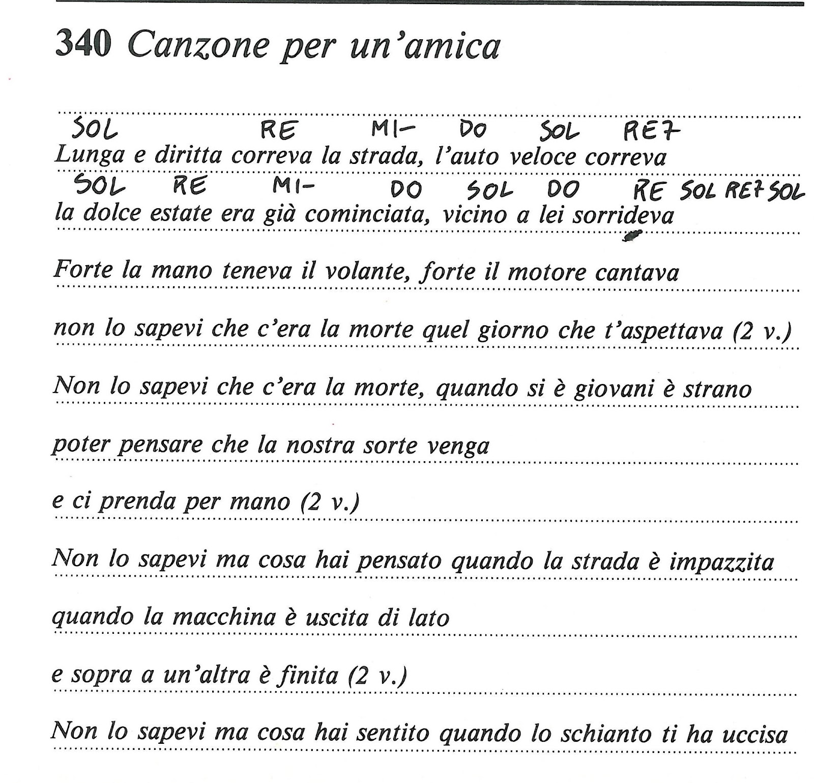 Lunga e diritta correva la strada l'auto veloce correva la dolce estate era già cominciata vicino a lui sorrideva vicino a lui sorrideva. Lunga e diritta correva la strada l'auto veloce correva la dolce estate era già cominciata. Lunga e diritta correva la strada. Forte la mano teneva il volante, forte il motore cantava, non lo sapevi che c'era la morte quel giorno che ti. Lunga e diritta correva la strada l'auto veloce correva la dolce estate era già.